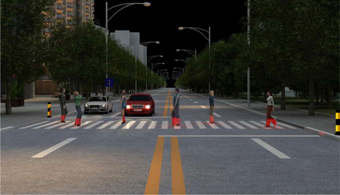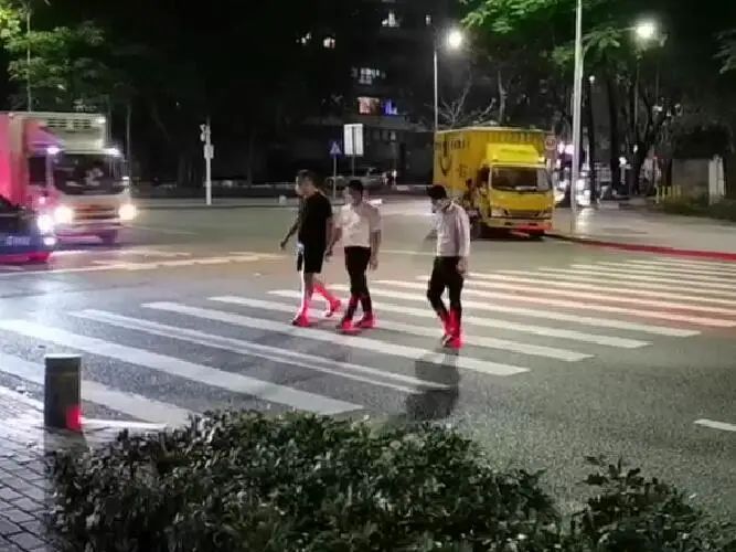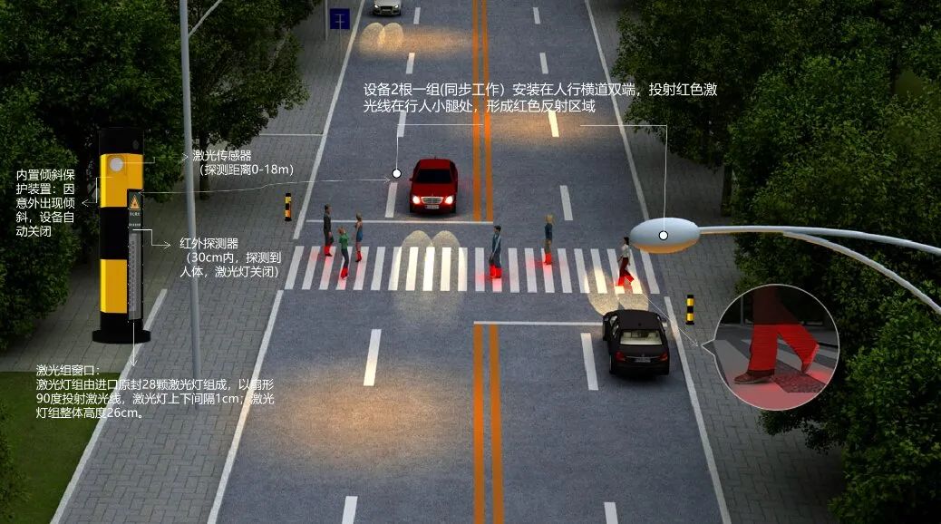 當(dāng)行人即將進(jìn)入斑馬線的瞬間,該設(shè)備探測到行人并投射28條紅色激光線到行人小腿處,形成“紅靴子”投影,這樣即使機(jī)動車駕駛員在遠(yuǎn)處也能得到警示,做到及時避讓前方行人。